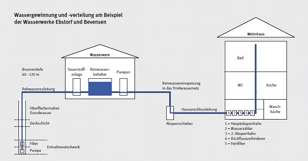 Im nördlichen Kreisgebiet Uelzens versorgen die beiden Wasserwerke Ebstorf und Bevensen die Verbraucher mit dem kostbaren Lebensmittel Wasser, im südlichen Raum übernehmen das die Werke Stadensen II und Niendorf II. Das Grundwasser wird als so genanntes Rohwasser mit Unterwasserpumpen aus bis zu 120 Meter tiefen Vertikalbrunnen gefördert. Gleichzeitig sorgt der dem Rohwasser zugegebene Sauerstoff dafür, den hohen Eisen- und Mangan-Gehalt auszufällen. Anschließend gelangt das gefilterte Rohwasser in Reinwasserbehälter und wird von dort über das Versorgungsnetz zu den Kunden transportiert. Das ist Natur pur: ohne aufwändige Behandlungen Wasser von hervorragender Qualität genießen.